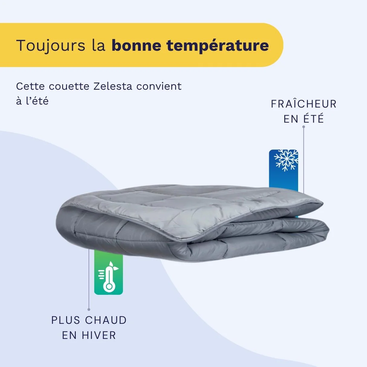 Zelesta Everyday Couette Été est conçu pour ceux qui aiment la sensation d'un lit propre, sans les tracas et sans Lavez, séchez et refaites votre lit en seulement 3 secondes grâce à la housse fixe.