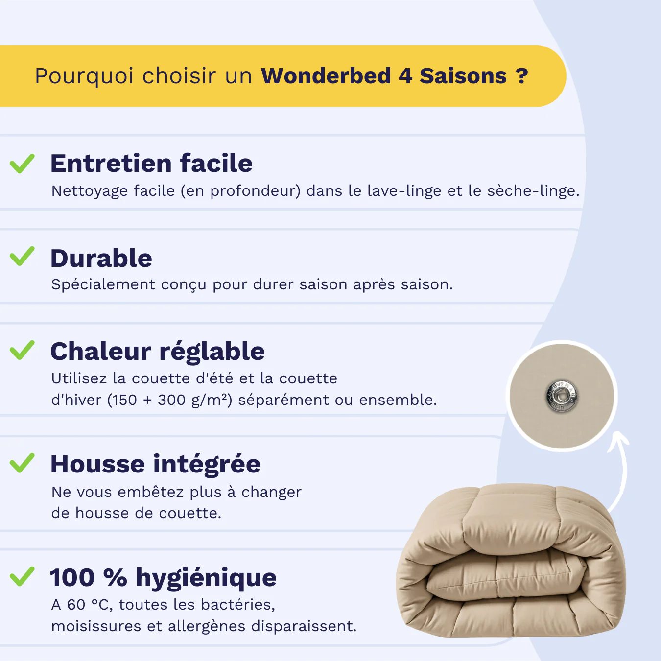 Avec un garnissage de 300 g/m² pour le Zelesta Wonderbed et de 150 g/m² pour le Zelesta Wonderbed Light, vous pouvez ajuster la chaleur idéale pour chaque saison. Utilisez la couette légère pour les nuits plus chaudes et ajoutez la couette plus épaisse pour un confort accru durant les mois les plus froids.